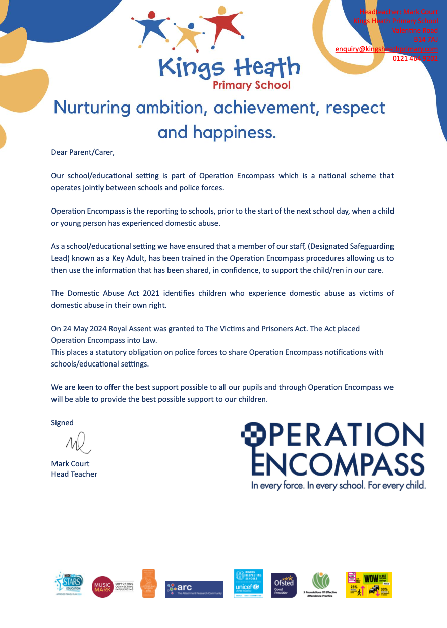 Operation Encompass Letter sent to parents/carers